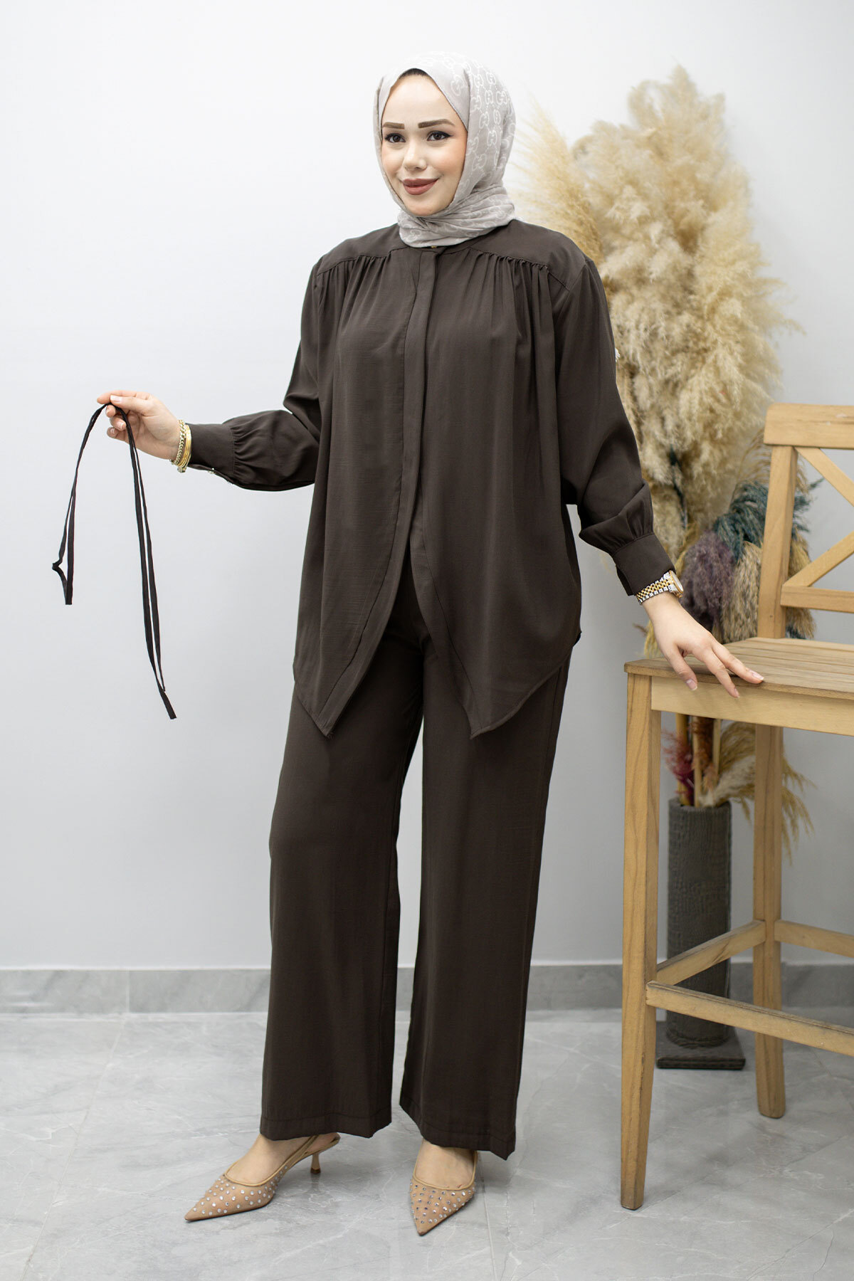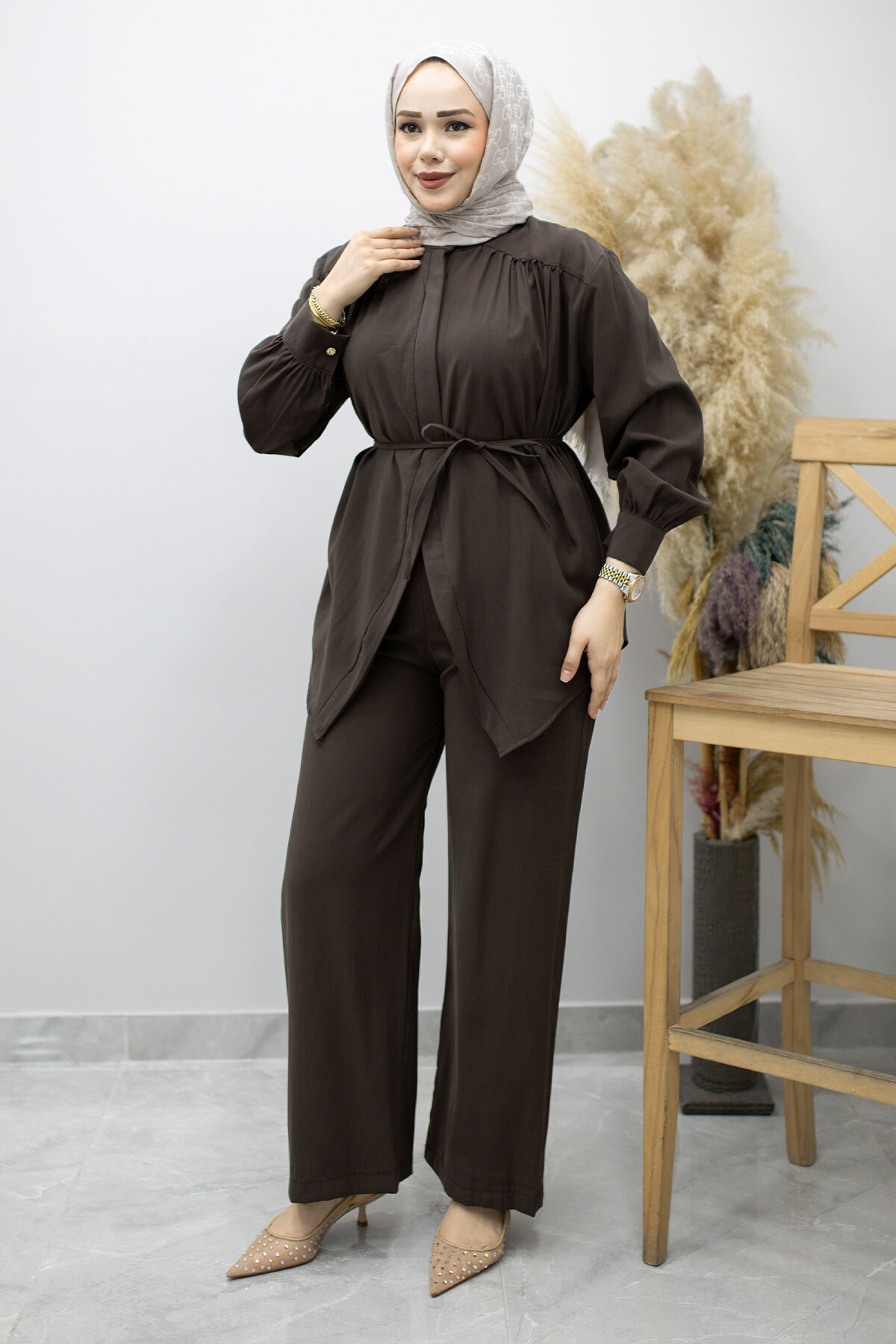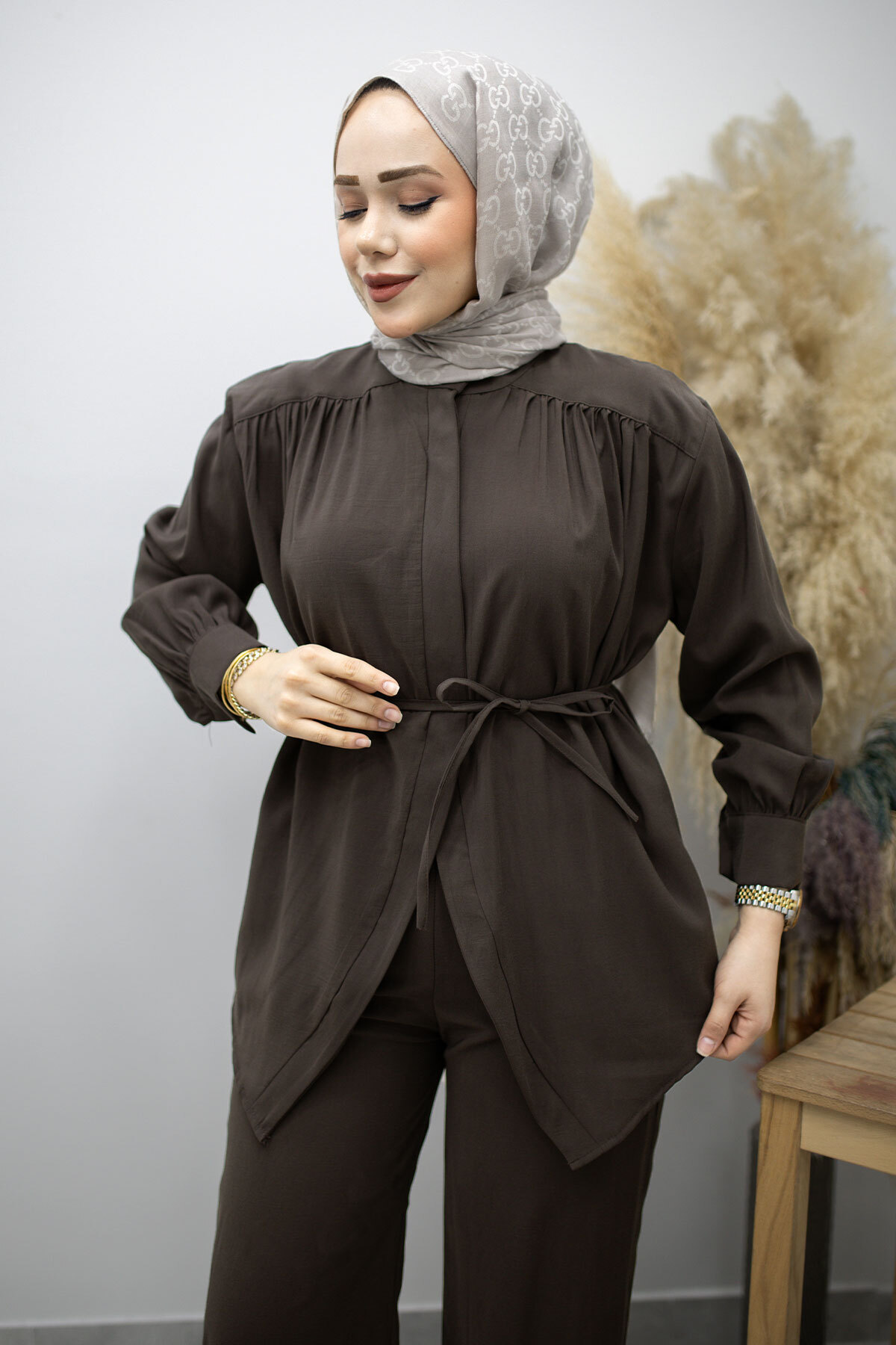 Ürün Özelliği : Yeni sezon Gizli Düğmeli Beli İpli İkili Takım modelidir.