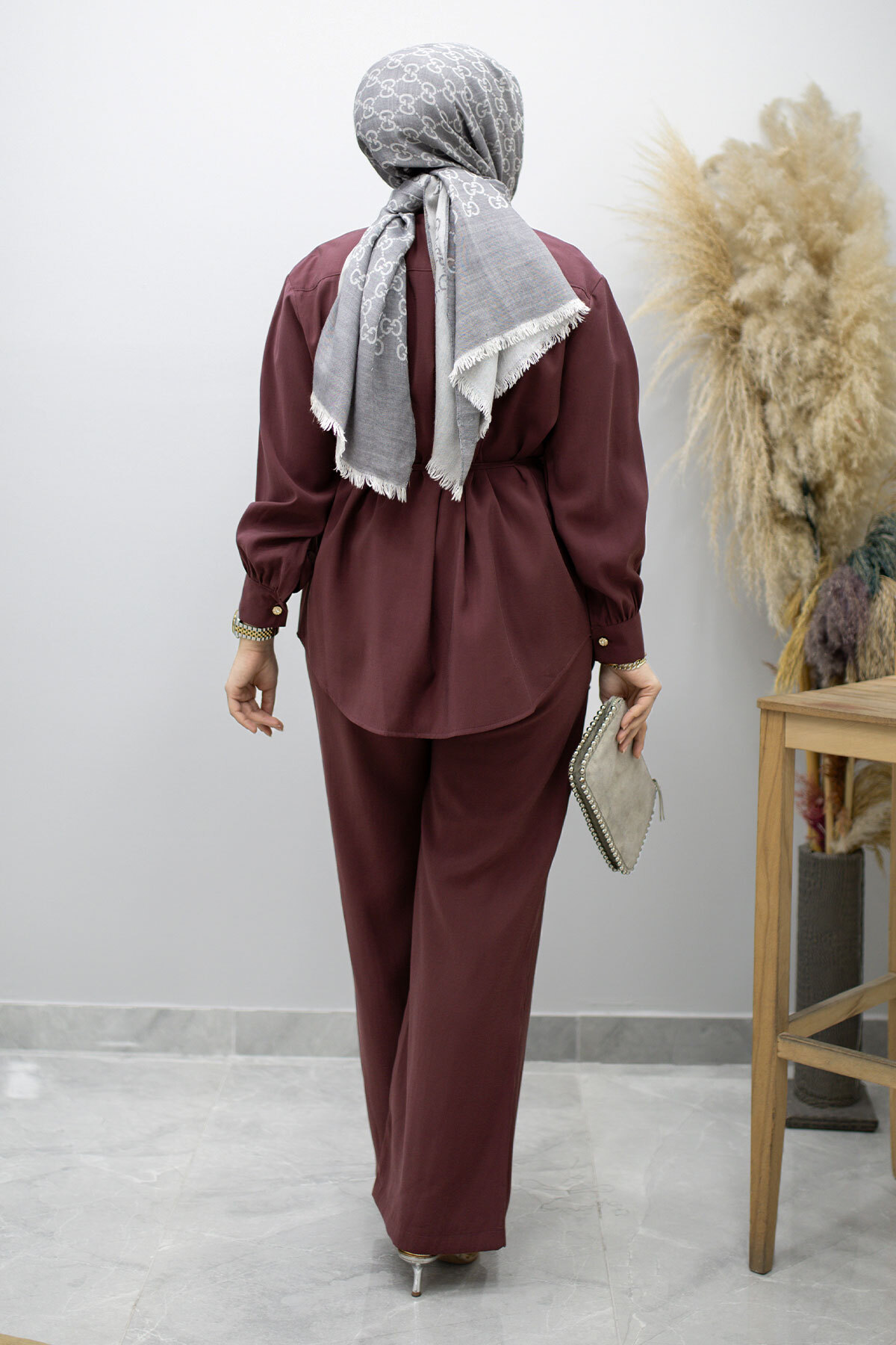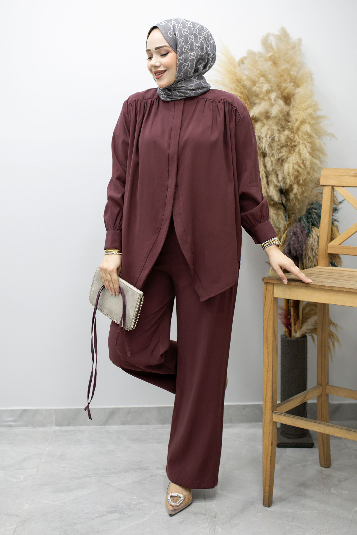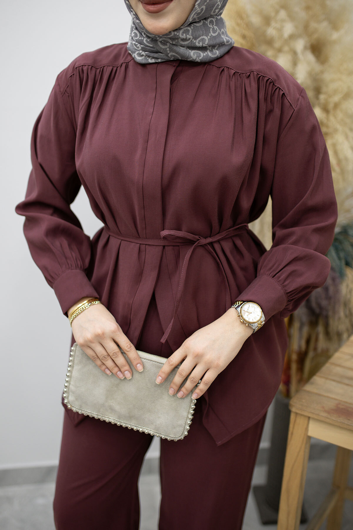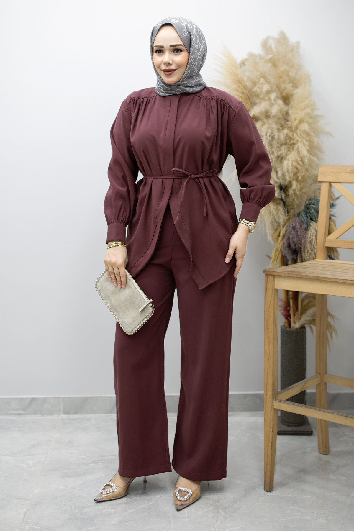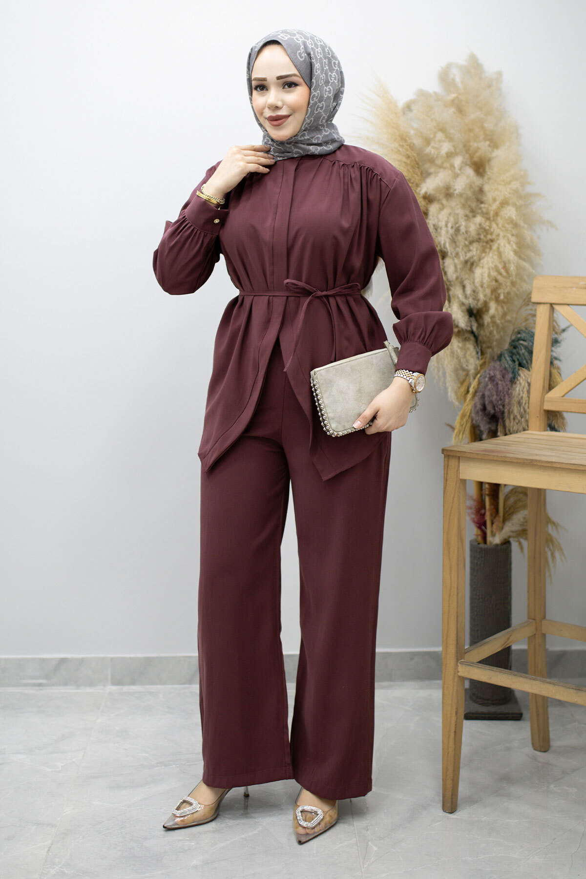 Gizli Düğmeli Beli İpli İkili Takım TSD260176 Mürdüm