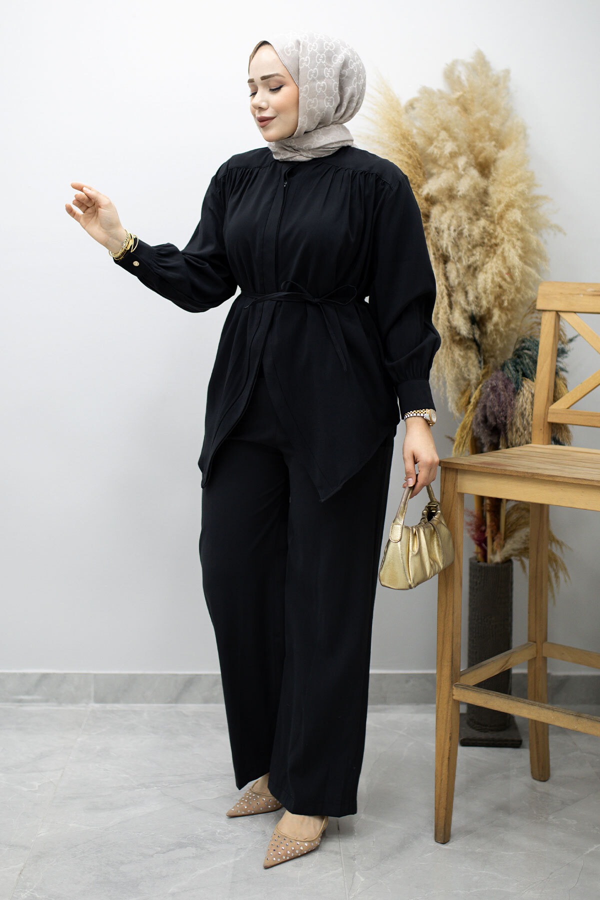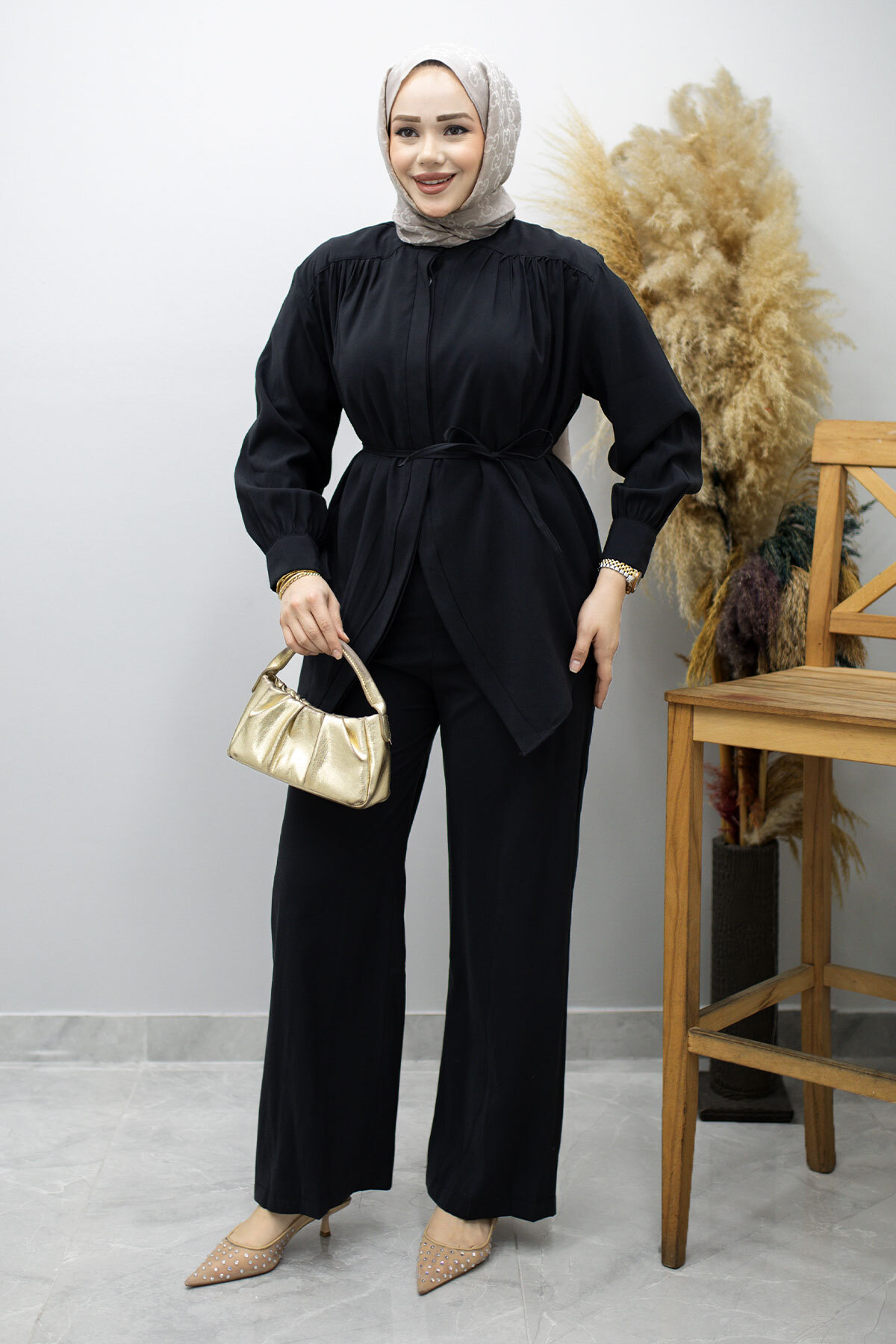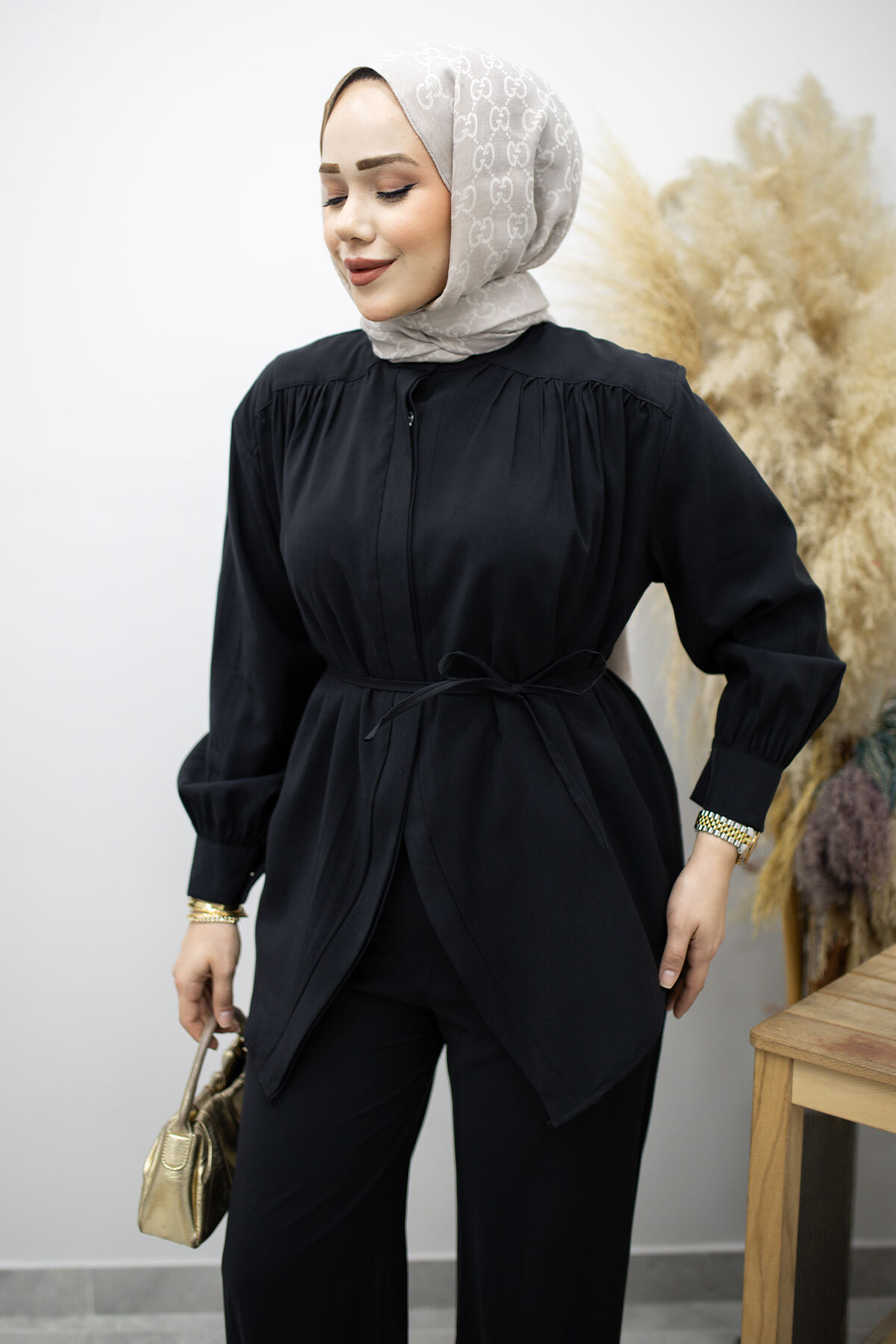 Ürün Özelliği : Yeni sezon Gizli Düğmeli Beli İpli İkili Takım modelidir.